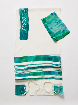 Watercolor stripes in quiet shades of green bring a fresh, contemporary interpretation to traditional tallit designs. This tallit is made from 100% silk crepe de chine, a soft and lightweight fabric that you'll love to drape around your shoulders.