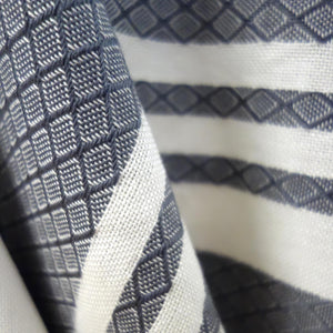 Traditional tallit designs with exquisite materials, woven in Chicago and sewn in North Carolina. Slate gray stripes against a crisp white background.